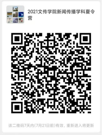 所有被录取的夏令营营员请于2021716日早9:00点之前扫下列二维码加入“2021文传公司新闻传播学科夏令营”微信群。请注意入群时将自己的昵称改为:姓名+营员编号。此群为夏令营期间唯一联系沟通方式,有问题可在群中提问,会有相应老师负责解答。