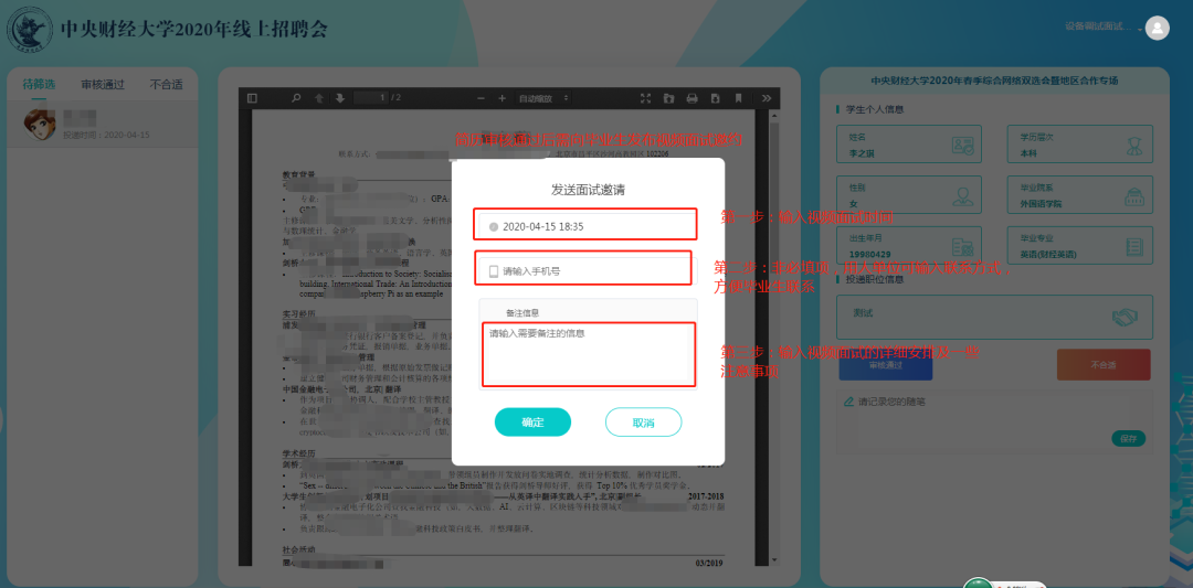 若简历审核通过即发送“面试邀请”—输入预计“面试时间”—非必填(用人单位手机号)—面试详细安排