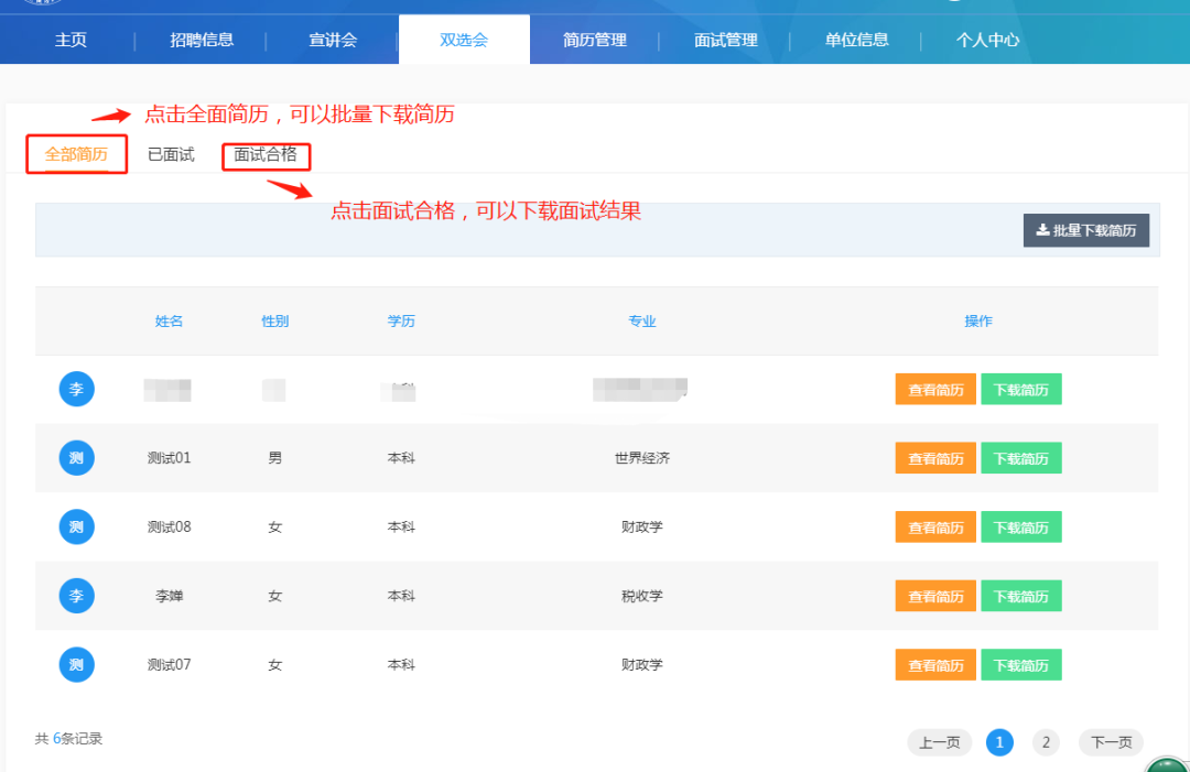 5.下载结果:可在简历管理下载简历,在面试管理下载面试结果。