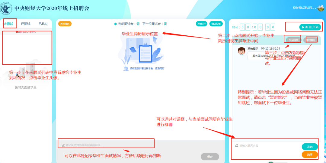 点击毕业生头像—点击面试开始—发起视频—面试评价