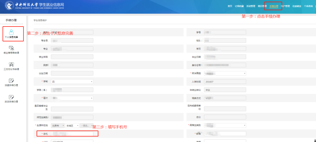 登录个人页面—点击手续办理—个人信息完善—填写手机号