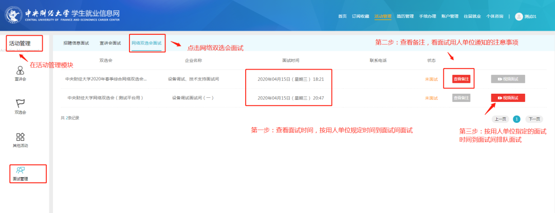 3.用人单位邀约面试:面试时间及安排会显示在毕业生个人主页,同时系统会发短信通知毕业生查看,请毕业生定时登录系统查看,一定不要错过。