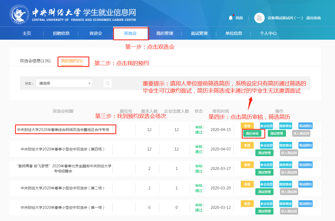 1.请用人单位按时筛选简历,只有简历通过筛选才能邀约面试,简历未查看或未通过毕业生均不能进入面试间。