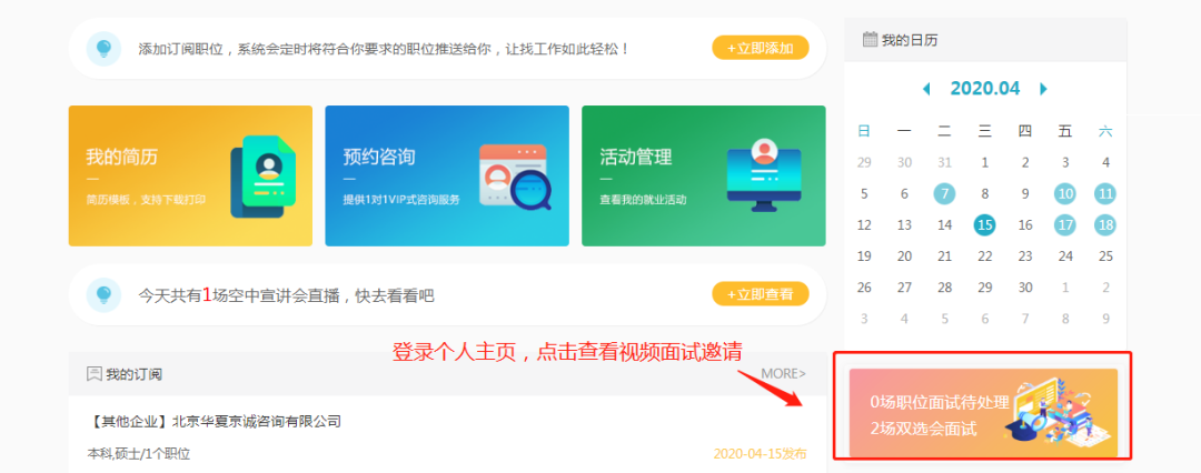 3.注意查看面试邀请:面试邀请安排会出现在毕业生个人主页,并通过手机短信通知,请毕业生一定及时查看,并及时对面试邀约进行反馈。