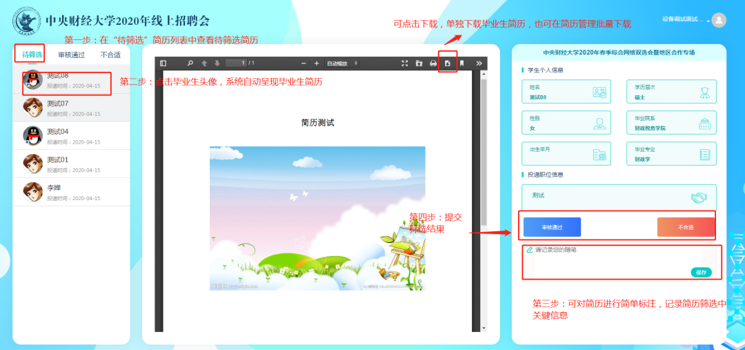 点击“待筛选”—点击毕业生头像—筛选并提交简历筛选结果