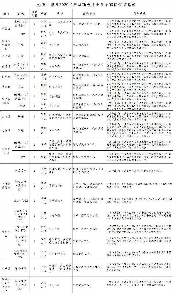 岗位及资格条件等具体要求详见《光明日报社2020年应届高校毕业生招聘岗位信息表》。