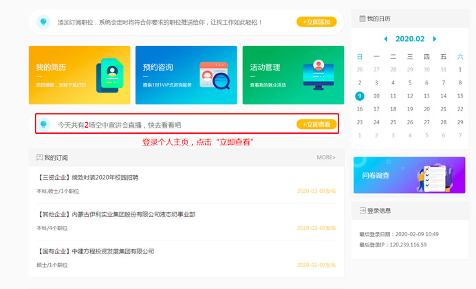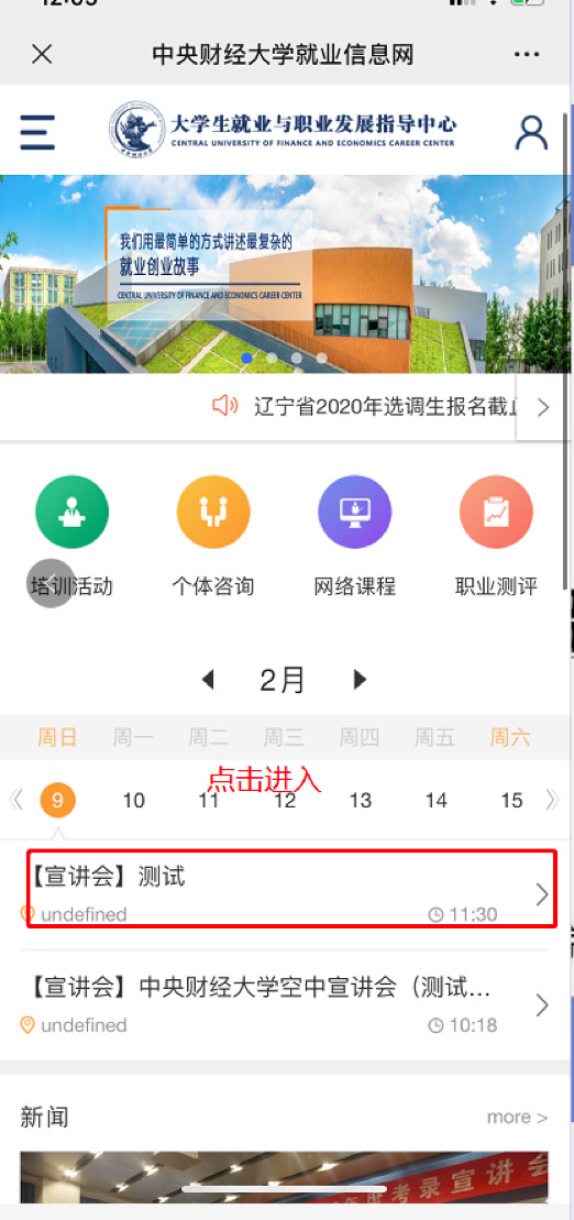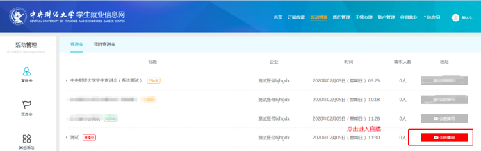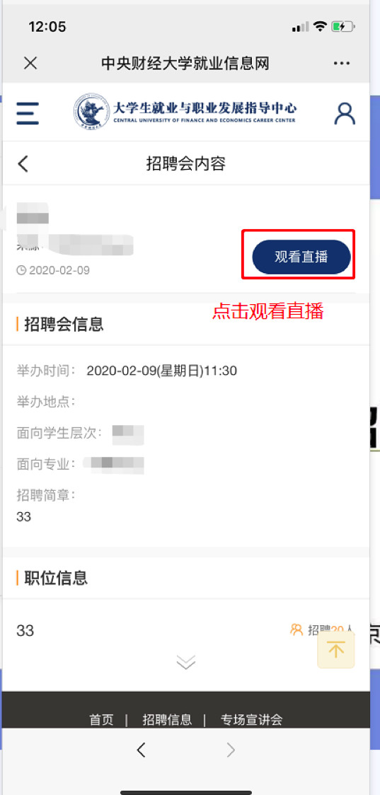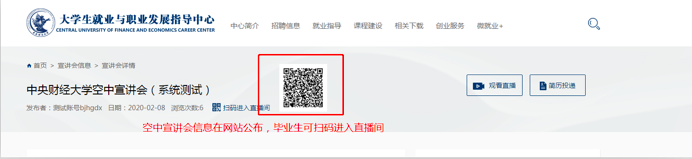 扫码(开播前系统自动生成)/点击“观看直播”进入/通过中财就业微信端进入
