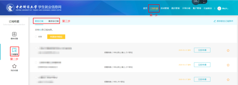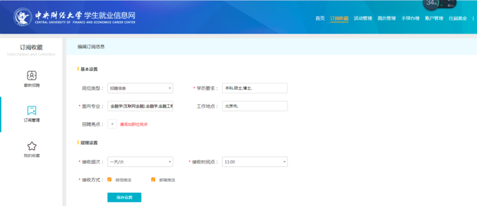 登陆进入“个人主页”,点击“订阅收藏”—“订阅管理”—“职位订阅/宣讲会订阅”—“立即添加”