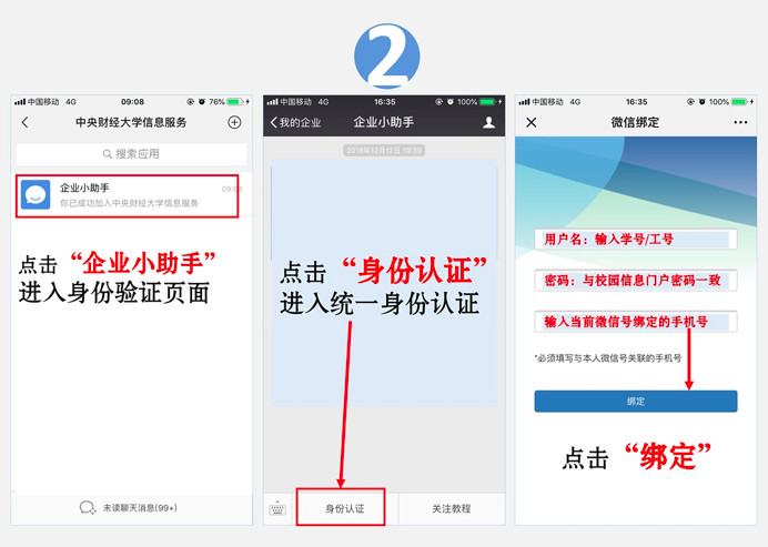 第二步:点击“企业小助手”进入身份验证页面点击“身份认证”输入用户名和密码,点击绑定