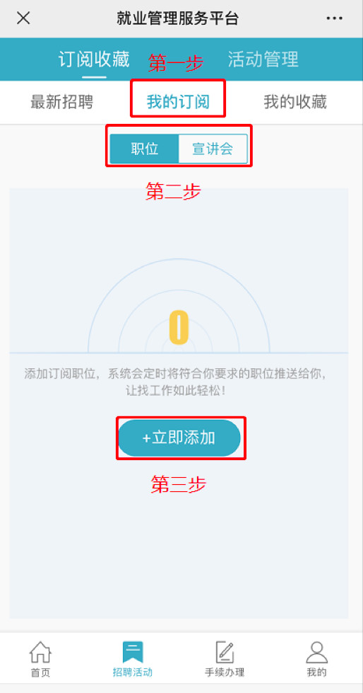 进入个人主页点击“招聘活动”—“我的订阅”—“职位”/“宣讲会”—“立即添加”