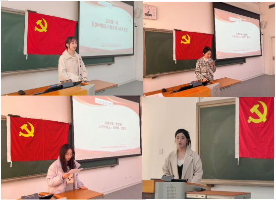 在预备党员接收环节,发展对象阙恋懿同志详细汇报了对党的认识、入党动机、本人及家庭基本情况,并从政治思想、学习工作、组织生活等方面进行回顾。她表示,经过这段时间的深入学习和不断实践,对党的理论知识和光荣历史有了非常深刻的理解,对党的宗旨、方针、政策、路线都有了进一步的了解,同时也提高了自身思想认识,增强了党性,更加坚定了加入中国共产党的决心和信心。随后,入党介绍人刘浩雨同志和郭彦彤同志分别介绍了阙恋懿同志在培养考察期间的表现与是否同意接收其为预备党员的意见;皮福玲同志代表党支部委员会,就阙恋懿同志的审查情况、思想政治、日常表现等方面进行汇报并发表意见。