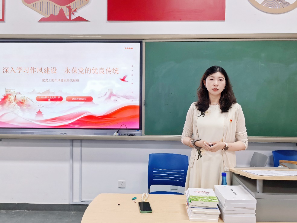 会议伊始,公司党委委员、本科生第三党支部书记芦姗以《深入学习作风建设、永葆党的优良传统》为题讲授专题党课,从作风建设的历史背景、党史上优良作风的形成过程与典型案例以及作风建设对员工党员的启示三方面讲授坚持作风建设的重要意义,并结合自身经历深刻感悟中央八项规定执行之后的变化,要求员工党员要以政治自觉抵制形式主义、官僚主义,以严谨态度践行实事求是,以作风建设夯实成长根基。