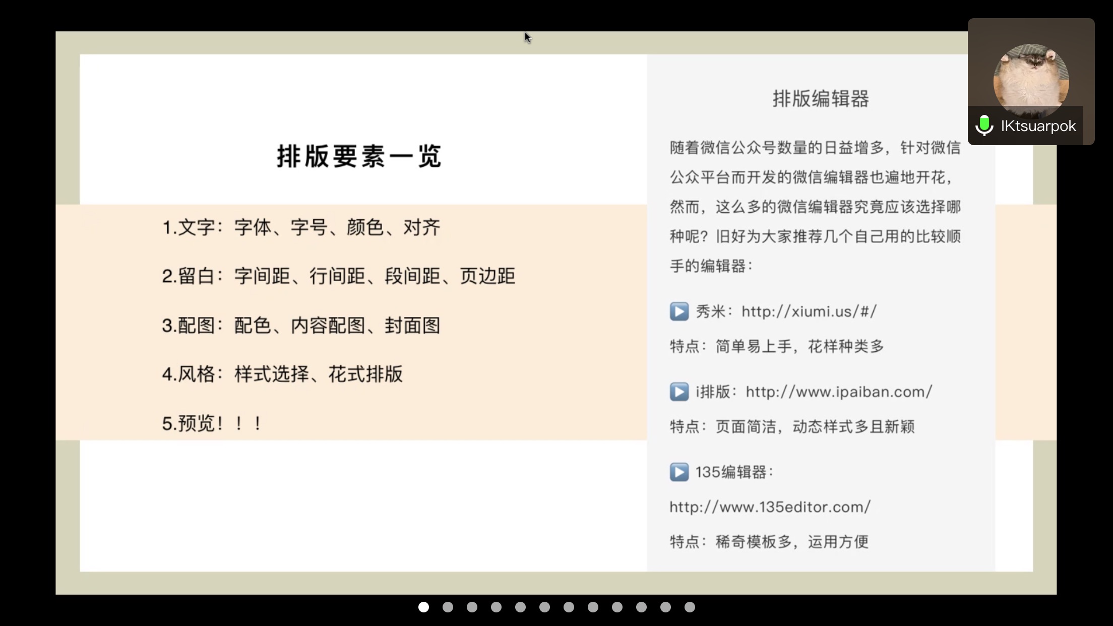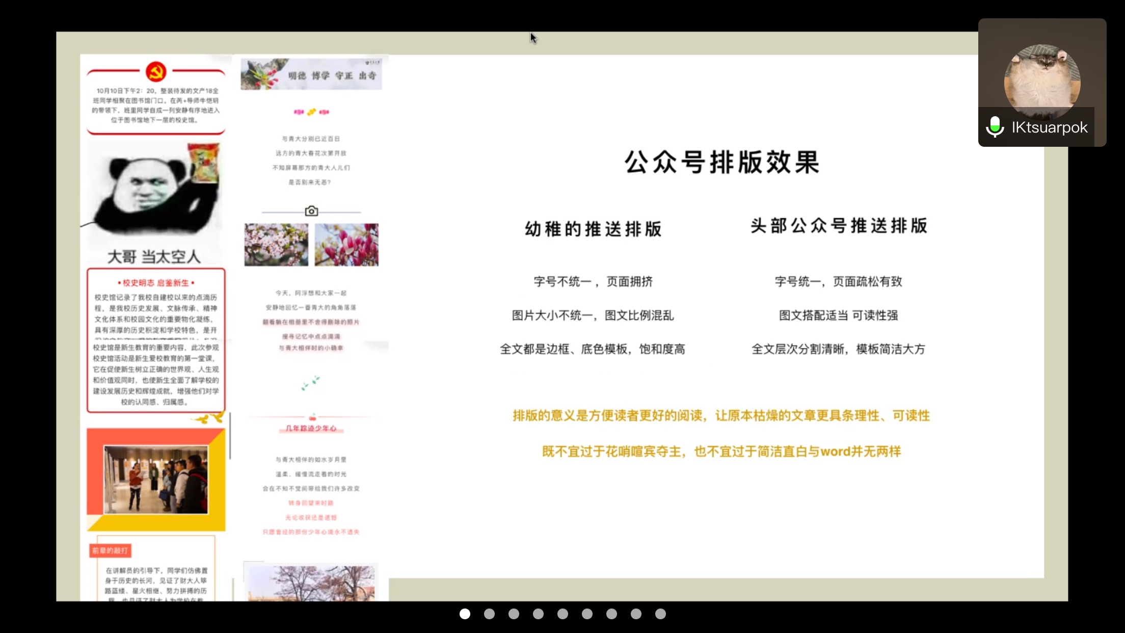 本次教学分享的围绕公众号的排版展开,希望同学们通过此次教学,对公众号排版中的模版使用及配图等方面有更深入的了解。会议开始后,韩永琦从三个方面对排版的相关事宜展开了说明,并且进行了现场答疑。