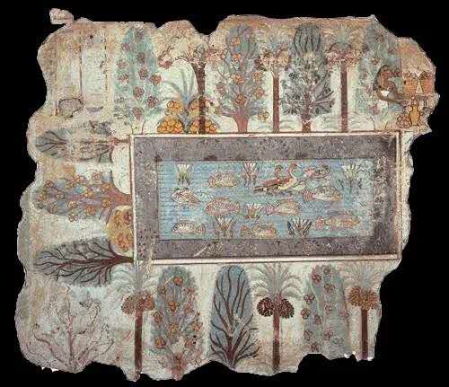 古埃及艺术具有高度辨识性和极强的视觉冲击力。当时的艺术家在绘画的时候,首先考虑的不是好不好看,而是去尽力做到完整。在墓室壁画《内巴蒙花园》中,画师刻意选择每个物体最清楚的视角,然后将其并置在同一平面去呈现,力图为逝者保留一切必需的信息。