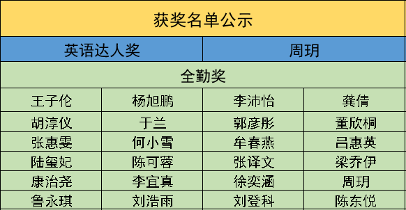 本次“英语云打卡”活动共分为两个板块,分别是常规任务:每日背诵英语单词;非常规任务:观看TED演讲视频/阅读文章。在21天的打卡旅程中,所有参与活动的同学累计单词背诵数量共41977个,平均约857个,共有25名同学坚持每天打卡,荣获“全勤奖”,此外,周玥同学成为单人背诵数量最多的同学,共计背诵2442个,荣获“英语达人奖”!播下一个种子,收获一种习惯,相信大家经过21天的坚持,已经对每日的英语学习形成了一种习惯!