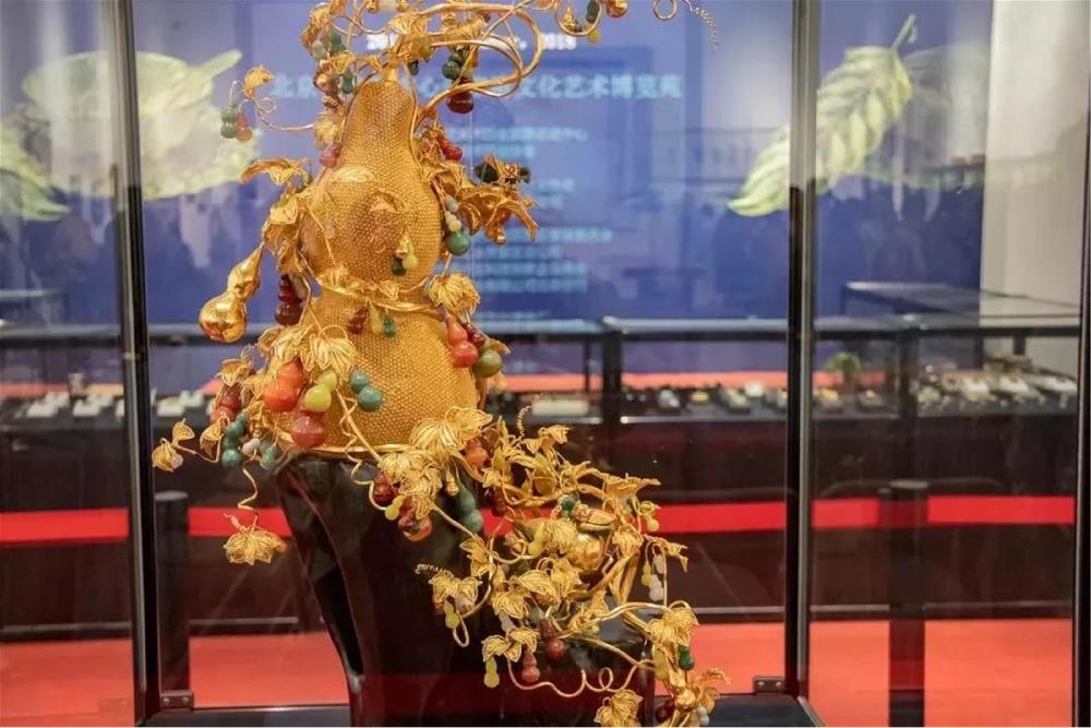 来自国家级工艺美术大师王树文大师的《子孙万代葫芦》。在这件作品中,王大师将声、光、电融入到作品中。葫芦上的知了栩栩如生,能煽动翅膀,还能发出声音和亮光。