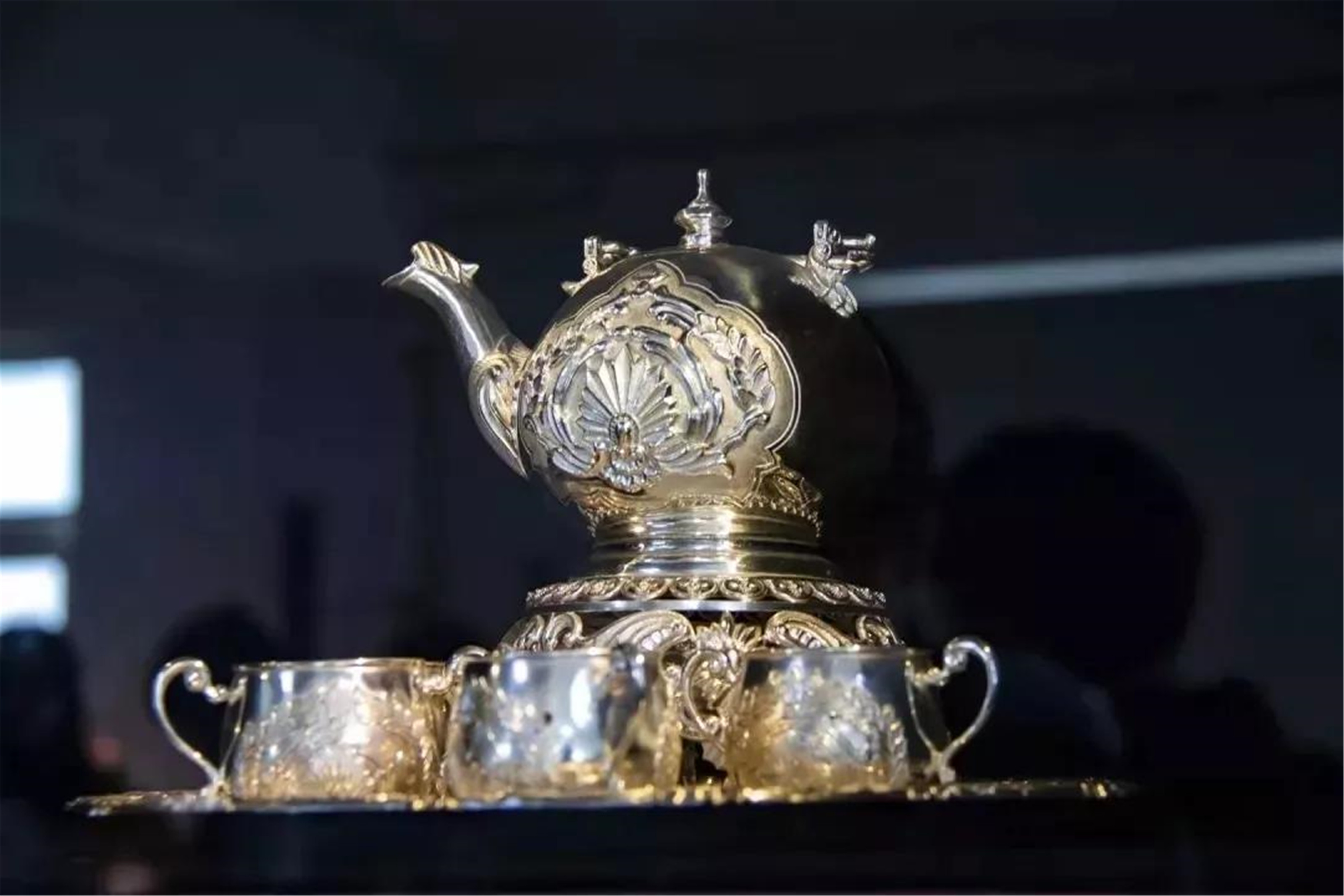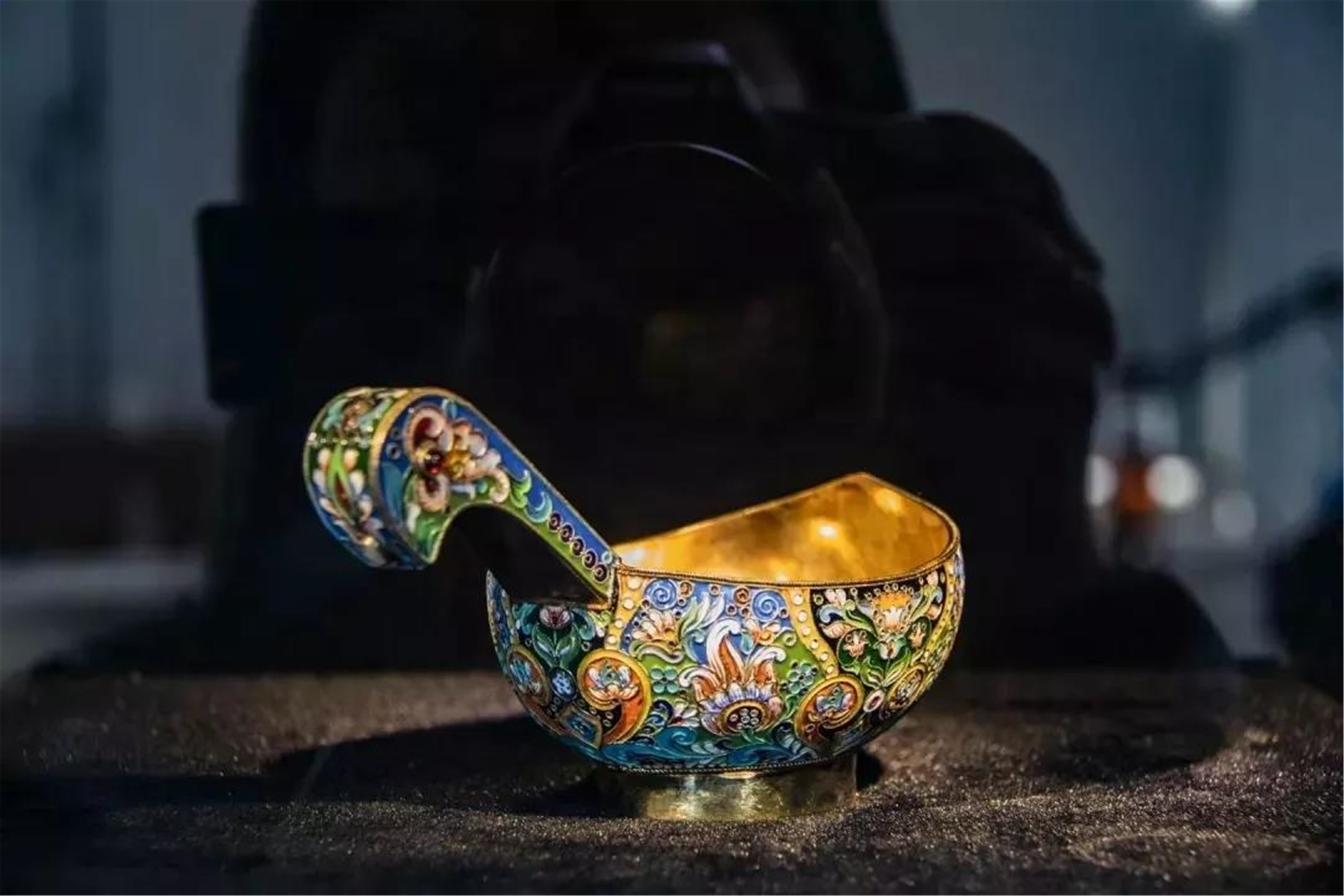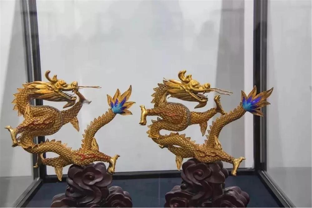 花丝镶嵌卡克图作品,“卡克图”集景泰蓝和花丝镶嵌这两门皇家工艺之所长,融汇东西方文化,色彩夺目、造型动人。卡克图是以蓝色为主色调,在金属质的胎体上,用金属丝刻画出各种花纹和图案,在图案中间充填釉料后入炉烧制,最后经鎏金打磨抛光而成。