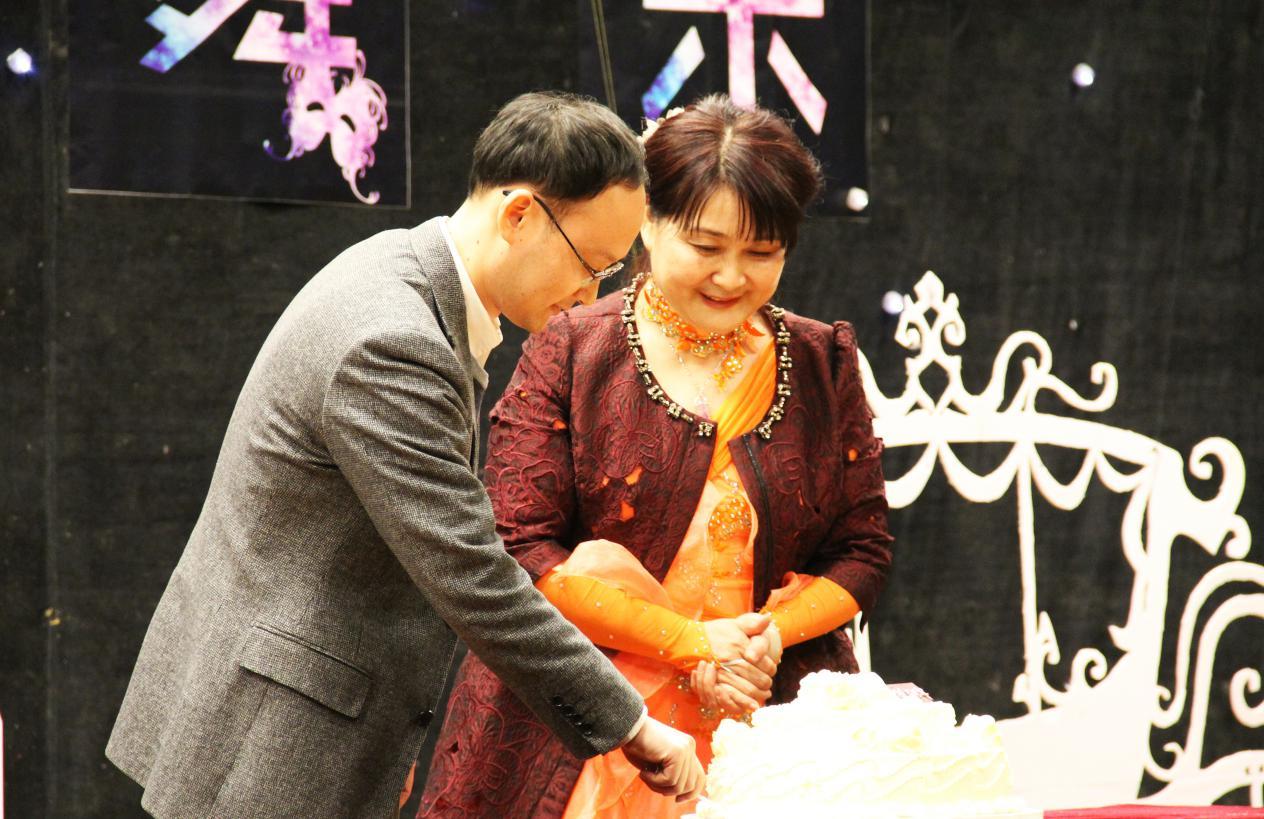 李炎老师与刘晓勤书记携手切分纪念舞乐5周年的蛋糕