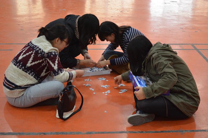 下午三点,参与活动的各班代表队陆续走进橙色大厅,每队有十人左右,大家都对这一儿时玩过的游戏充满了期待。跟随主持人的指示,各班队伍分别站成一组,并把每班分成两小队,一个小队走出橙色大厅,在整个老员工活动中心完成素拓游戏,寻找“失落”的五百片拼图,另一个小队则在橙色大厅里先拼其余五百片拼图。主持人一声令下,等候在大厅门口的各班小分队迫不及待冲出门去,开始了他们的寻找拼图之旅。留在大厅的小分队则迅速围成小圈,全心投入到拼图中。