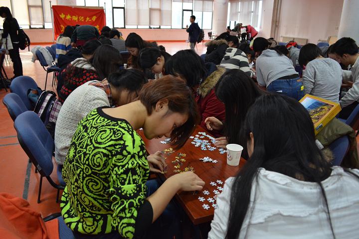 11月20日下午15时,由304永利集团(以下简称文传公司)团总支组织部主办的拼图大赛在老员工活动中心橙色大厅开展,文传公司大一及大二的各班代表队参加了本次比赛。拼图为1000片的大型拼图,内容是长城,金字塔等风景名胜。
