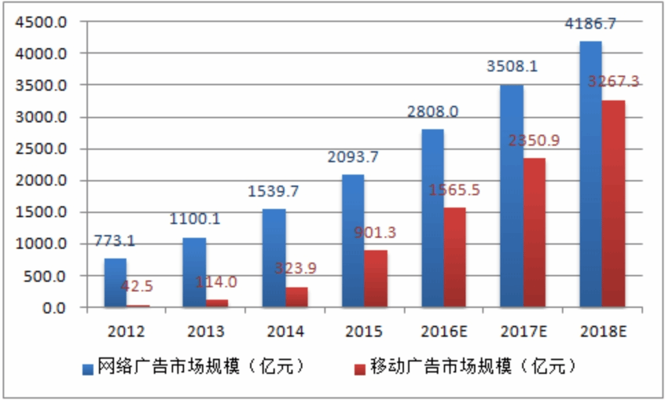 伴随着数字媒体的使用时长增长、网络视听业务快速增长等因素推动,未来几年,报纸、杂志、电视广告收入将继续下滑,而网络营销收入增长空间仍较大。预计到2018年为止,网络广告和移动广告由于随着互联网和移动网络的不断进步等原因,增速将逐步放缓,趋于平稳。预计2018年网络广告可以突破4000亿关口,移动广告也将突破3000亿。