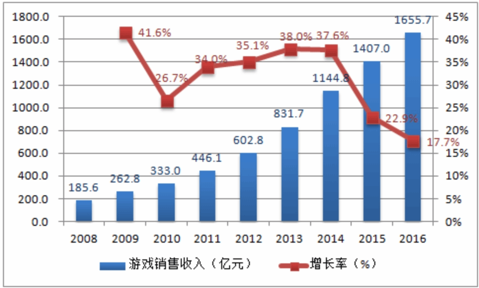 2016年中国游戏收入规模1655.7亿元,同比增长17.7%,增速持续放缓。用户规模5.66亿人,同比增长6%。随着人口红利的逐步释放,中国游戏产业历经几年爆发式的增长后增速明显放缓。