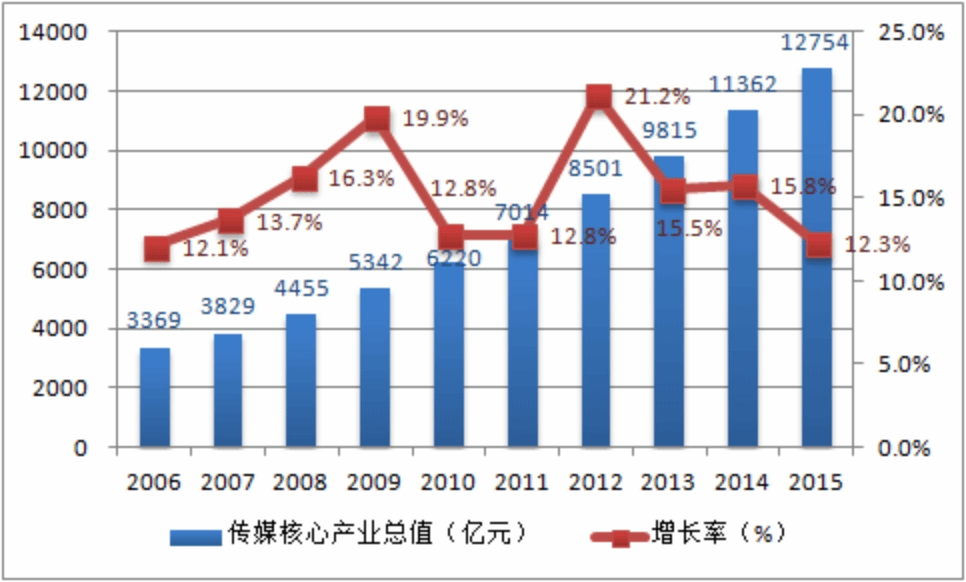 2006-2015 年中国传媒产业总值与增长率
