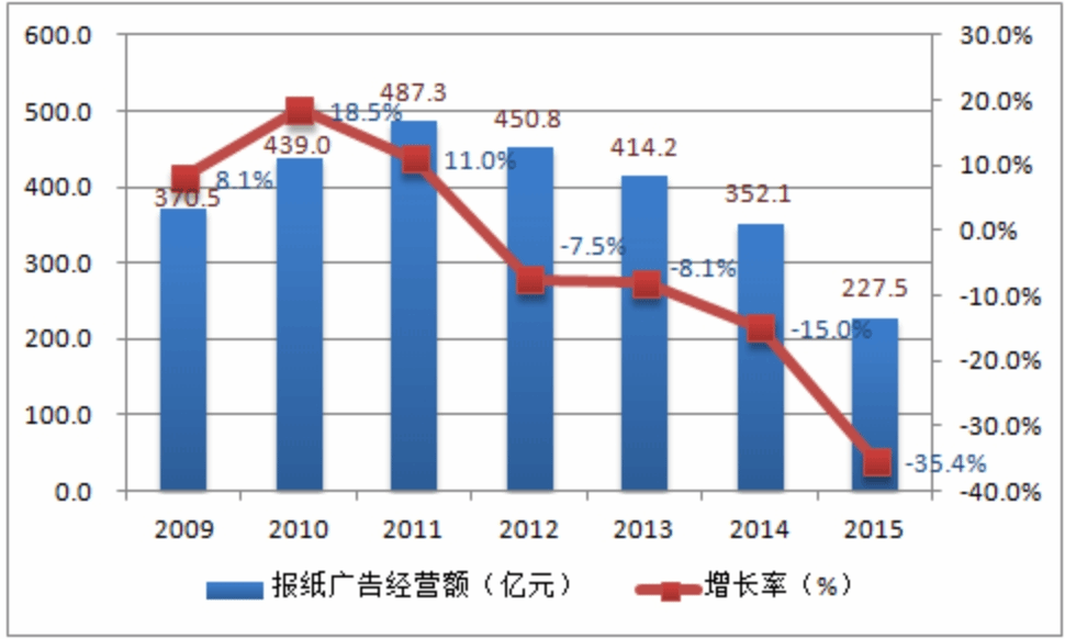 2009-2015年报纸广告经营额及增长率