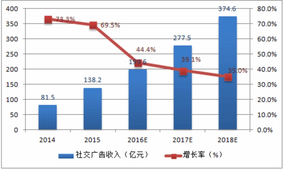 2015年中国社交广告规模为138.2亿元,预计到2018年将接近400亿元。中国及全球的社交网络营销整体均呈现快速增长的趋势,广告价值不断凸显。无论是Facebook、Twitter,还是微博、QQ空间、微信朋友圈,社交广告的发展仍具有较大空间。