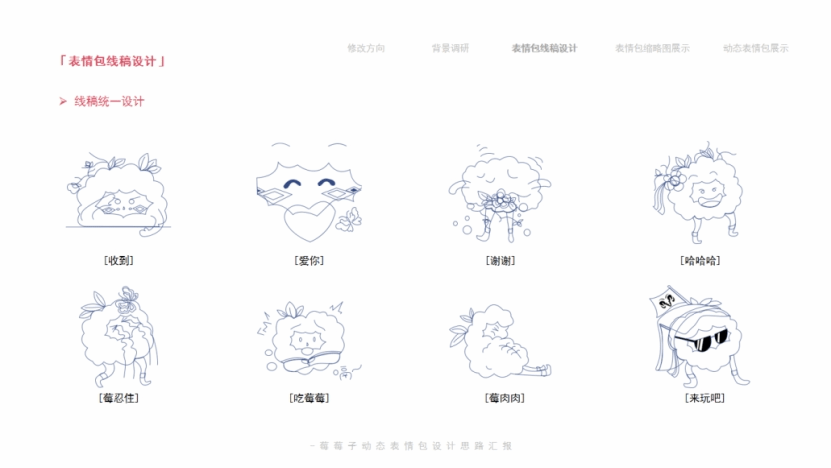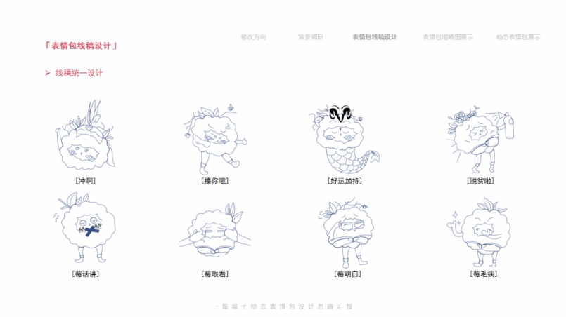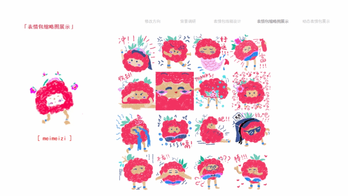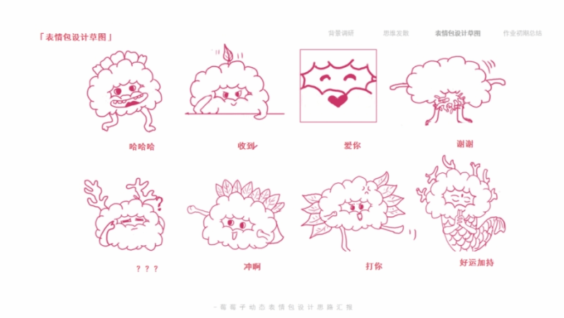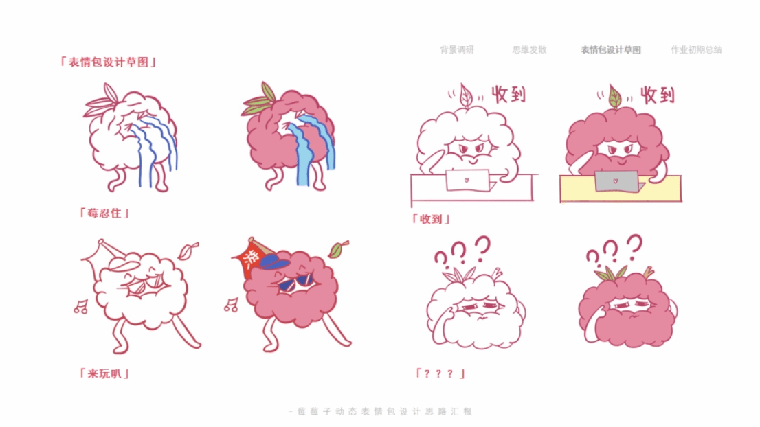 同学们每一份的努力,王昭老师都看在眼里。在谈及这次的创作时,王老师言语间展现出了对同学们的认可。越是喜欢自己的团队成员,便越希望他们能做到完美,长期以来王昭老师都以高水准要求着设计团队。在设计之初,他就要求同学们在开始之前,做一个基础的调研,以便确定自己的创作方向。正是有了这一过程,后续的设计才变得较为顺利,人们才能看到风格各异的树莓主题表情包,为树莓媒体形象的推广提供了更多的可能。