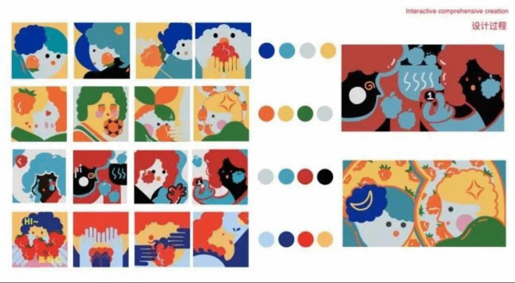 从最初的立意到最终的上线,南阳树莓表情包的诞生历程,见证了无数次的推翻重来,代表了一段段的摸索试探,也凝聚了创作者的精益求精,恰如陈梦圆小组从平面矢量到蜡笔填涂表现形式的颠覆,高露洋小组在美式波普风里对颜色深浅的摸索。他们的不断尝试、精雕细琢,都是为了更完美的视觉表现效果。