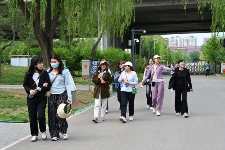 昌平新城滨河森林公园(白浮泉公园)内绿意盎然,水波潋滟。报名参加活动的教师们沿滨河步道阔步前行。初夏的公园景致如画,碧水蜿蜒,林荫夹道,大家或三五成群畅谈工作生活,或驻足拍摄记录生态美景。全程约3公里的路线中,大家精神抖擞、笑语不断,展现出积极向上的精神风貌。