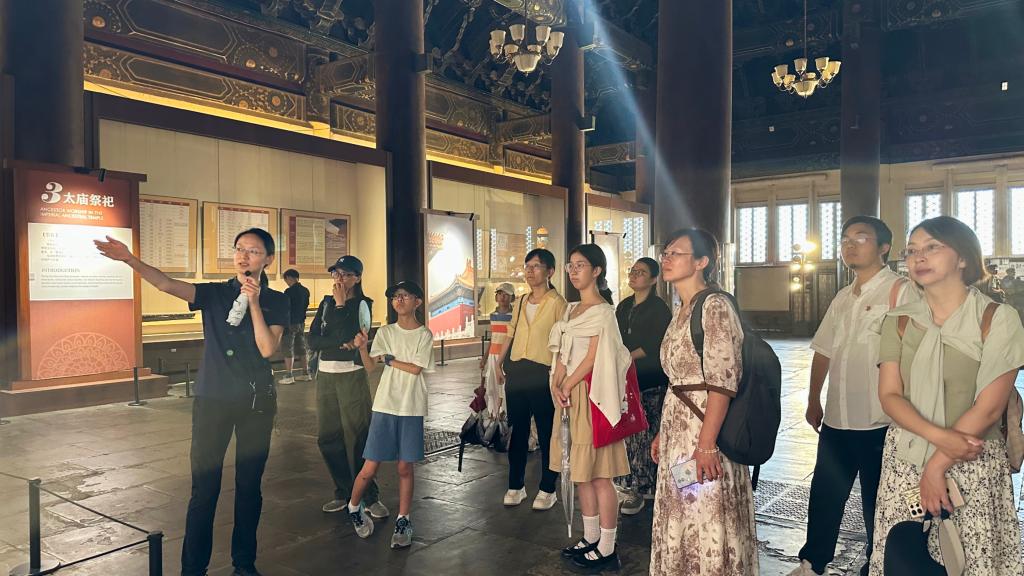 在工作人员的带领下,教师们怀着憧憬地心情依次参观了太庙享殿、寝殿、祧庙三大殿。太庙作为明清两代皇家祖庙,是中国现存规模最大、格局最完整的皇家祖先祭祀建筑群。工作人员结合殿宇的建筑特色,详细讲解了太庙历史:从明清皇家祖庙的地位到 “左祖右社”的都城规划内涵,以及三大殿中轴线布局及各殿祭祀功能、仪式流程、祭祀制度、礼乐器等。教师们漫步其中,被这座宏伟建筑所承载的历史文化深深震撼。