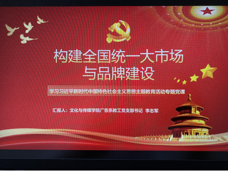 2023年5月10日,广告系教工党支部举办了学习贯彻习近平新时代中国特色社会主义思想主题教育专题党课,主题为《构建全国统一大市场与品牌建设》,由广告系教工党支部书记李志军主讲,广告系教工党支部全体党员参加。