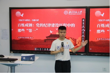 北京师范大学马克思主义公司求索学社宣讲团团长陈正以《百炼成钢:党的纪律建设历程中的那些“第一”》为题,分享了中国共产党的纪律建设走过的创立与探索、推进与发展的百余年历程:第一次提出“党的纪律为铁的纪律”的概念,出台第一份反腐文件,成立第一个中央纪律检查机关,制定第一部审计法规,查处新中国成立后第一个反腐大案,公布改革开放后第一部党内法规……他的宣讲让党员们从那些“第一”中可以发现,党始终坚持把严明纪律作为红色基因深植自身肌体之中,维护党的团结统一,永葆政治本色。