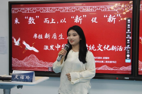 公司研究生第二党支部书记、校研究生宣讲团执行团长皮福玲以《乘“数”而上,以“新”促“新”——厚植新质生产力,激发中华优秀传统文化新活力》为题,结合所学专业和典型案例分析日新月异的数字技术是如何被运用于中华优秀传统文化的保护、转化、创新和传播实践,进一步阐释实施国家文化数字化战略是党中央顺应时代潮流做出的决策部署。科技创新赋能文化的传承,而中华优秀传统文化中最宝贵的思想精髓,为推动高质量发展、真正产生和创造出新质生产力也提供了源头活水,最后她呼吁各位党员共为新质青年,奋力书写数字文化强国的新时代答卷。