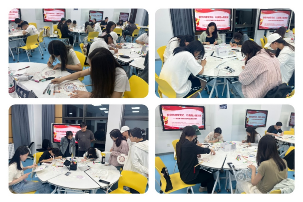 研究生第二党支部党员、2022级当代视觉理论探索与创意创新专业硕士茅嫣薇讲师以《寻心归处,相愈敦煌——创新传统文化,共筑文化自信》为题展开了一堂别开生面的美育课程。她以2024春晚节目《年锦》作为引子,带同学们走进了敦煌纹样的世界,详细讲解了敦煌藻井纹样不同历史时期的发展变化,并介绍曼陀罗绘画艺术疗愈的机制和步骤。她指出,敦煌藻井纹样因其具有图案的规律性、几何性和对称性,以及色彩的丰富和协调,能够有效纾解压力。随后,她还详细演示了绘画工具的使用方法,同学们在实践中受益匪浅。