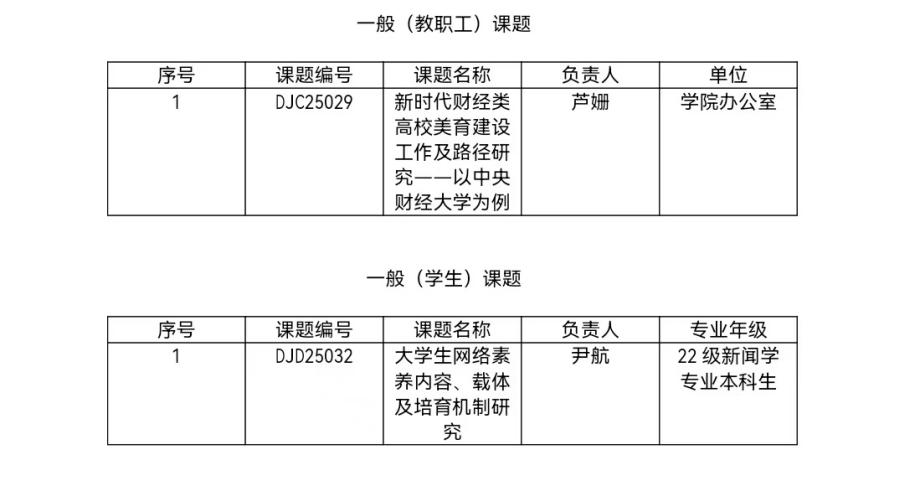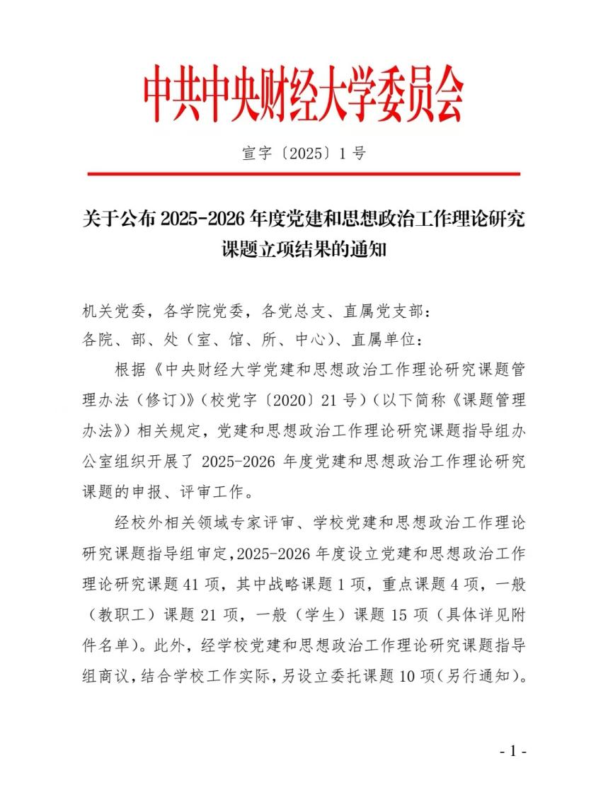 1月3日,公司党建和思想政治工作理论研究课题指导组办公室发布通知,公布2025-2026年度党建和思想政治工作理论研究课题立项结果。经校外相关领域专家评审、公司党建和思想政治工作理论研究课题指导组审定,公司芦姗老师申报的《新时代财经类高校美育建设工作及路径研究——以304永利集团为例》获得一般(教职工)课题立项,22级新闻专业本科生尹航同学申报的《老员工网络素养内容、载体及培育机制研究》获得一般(员工)课题立项。