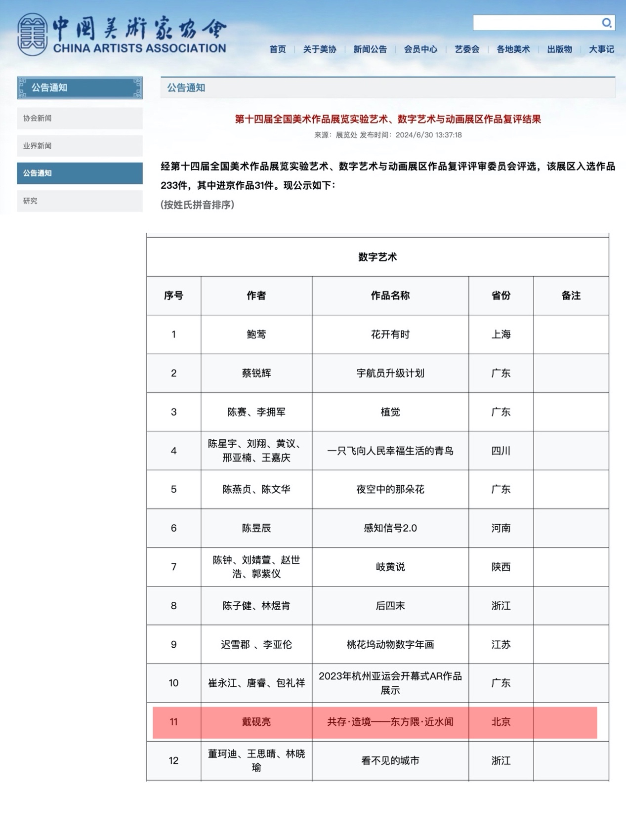 近日,第十四届全国美术作品展览结果正式公布。实验艺术、数字艺术与动画展区作品复评结果中获悉,公司艺术系教师戴砚亮主创的数字艺术作品《共存·造境-东方隈,近水闻》入选该展区展览作品。