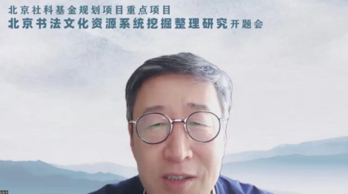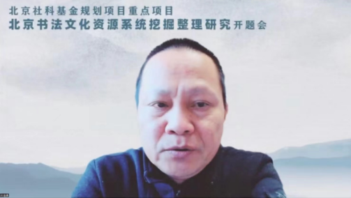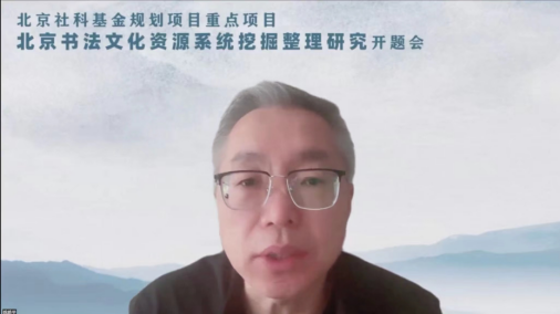 随后,项目主持人张冰教授对《北京书法文化资源系统挖掘整理研究》课题研究的研究背景、总体思路、研究框架、难点及专家反馈与相关调整等方面做详细开题阐述。他提出,课题以国家文化战略要求、北京市全国文化中心建设、北京书法文化资源的厚度与价值以及当代书法发展的必然要求为基础与指南,秉持“理论基础—分类挖掘—体系构建—综合建议”的研究路径,经过对北京书法文化资源的系统挖掘与网格化整理研究,将构建特色鲜明的北京书法文化体系,并对北京书法文化资源的创新性利用提供建议与学术实践参照。综合课题组成员的研讨以及评审专家反馈,张冰教授对课题框架进行了适当提炼与聚焦调整。