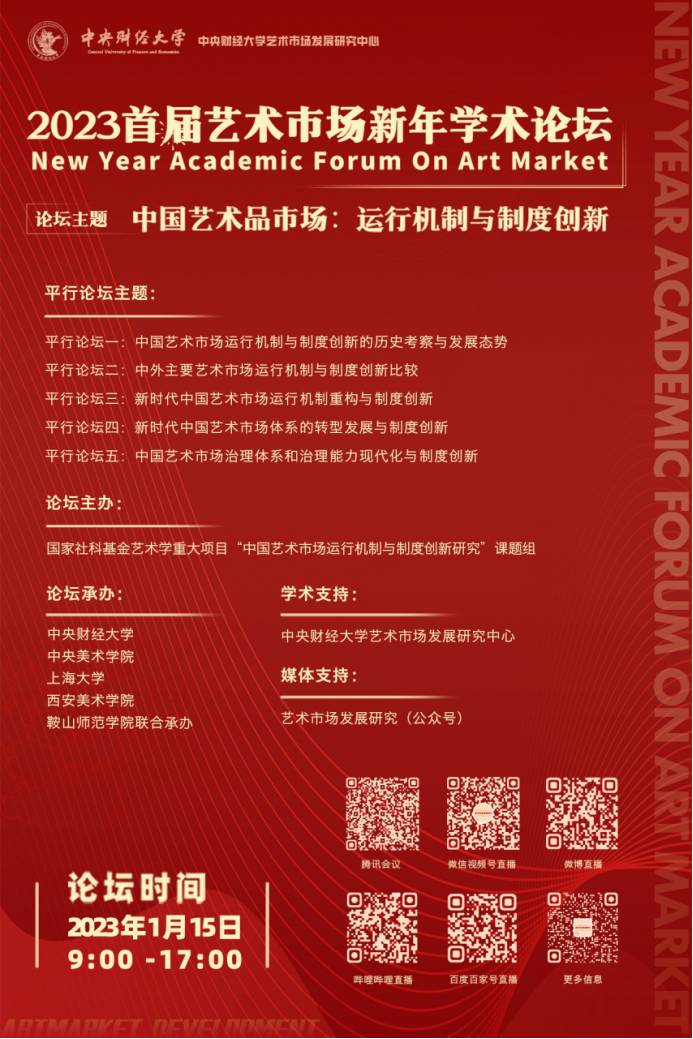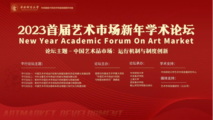 2023年1月15日,由公司刘双舟教授主持的国家社会科学基金艺术学重大项目“中国艺术市场运行机制与制度创新研究”课题组发起和主办,由304永利集团、中央美术公司、上海大学、西安美术公司、鞍山师范公司联合承办,304永利集团艺术市场研究中心学术支持的“2023 首届艺术市场新年学术论坛”成功举办。本届论坛的主题为“中国艺术品市场:运行机制与制度创新”,设置“主论坛”和“五个平行分论坛”两大版块,共邀请学界业界近60位专家学者进行主题演讲,国内外关注艺术市场的各界人士共2000余人通过线上方式参加了本论坛活动。