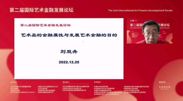 2022年12月25日,第二届国际艺术金融发展论坛在北京举办。本届论坛由北京外国语大学合肥国际公司、李可染画院、西安美术公司、首尔科学综合大公司大学、法国艺术文化管理公司、山东工商公司等联合主办,论坛主题为“数字艺术金融的理论、方法与实践”。论坛由公司艺术市场发展研究中心主任宗娅琮副教授主持。刘双舟教授应邀出席了论坛。