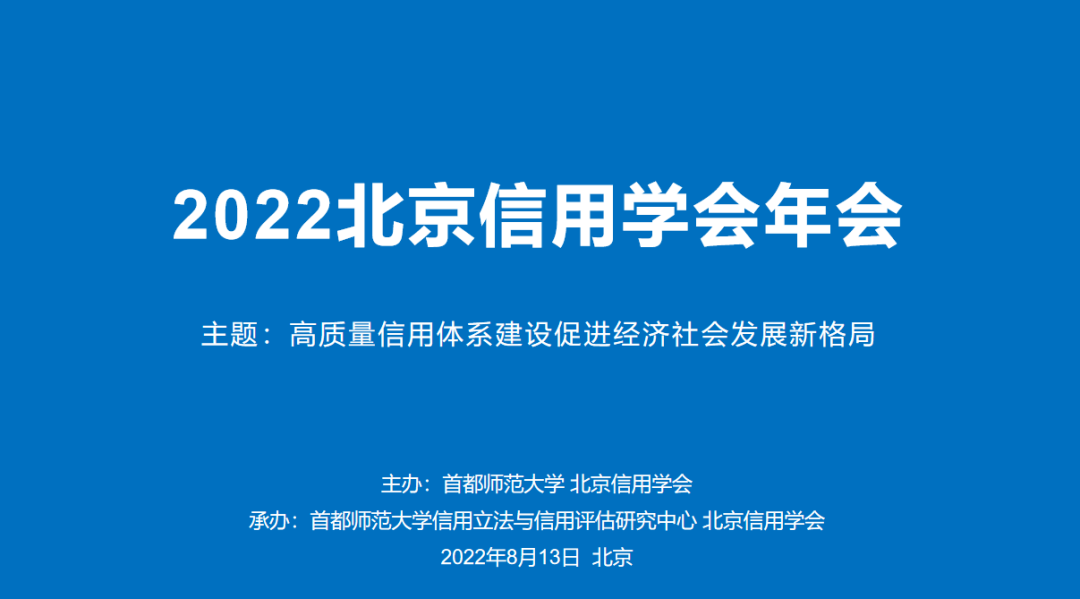 2022年8月13日,2022北京信用学会年会暨信用学术论坛在北京举行。这是2021年北京信用学会成立以来的首次年会,主题是“高质量信用体系建设促进经济社会发展新格局”。本次年会内容包括1场开幕式、3个平行论坛、6个主题论坛。年会立足新发展阶段,贯彻新发展理念,围绕司法公信、政务诚信、金融信用、知识产权信用、艺术品市场信用、商会行业协会信用等领域,就高质量社会信用体系建设中的焦点、热点和难点问题展开研讨