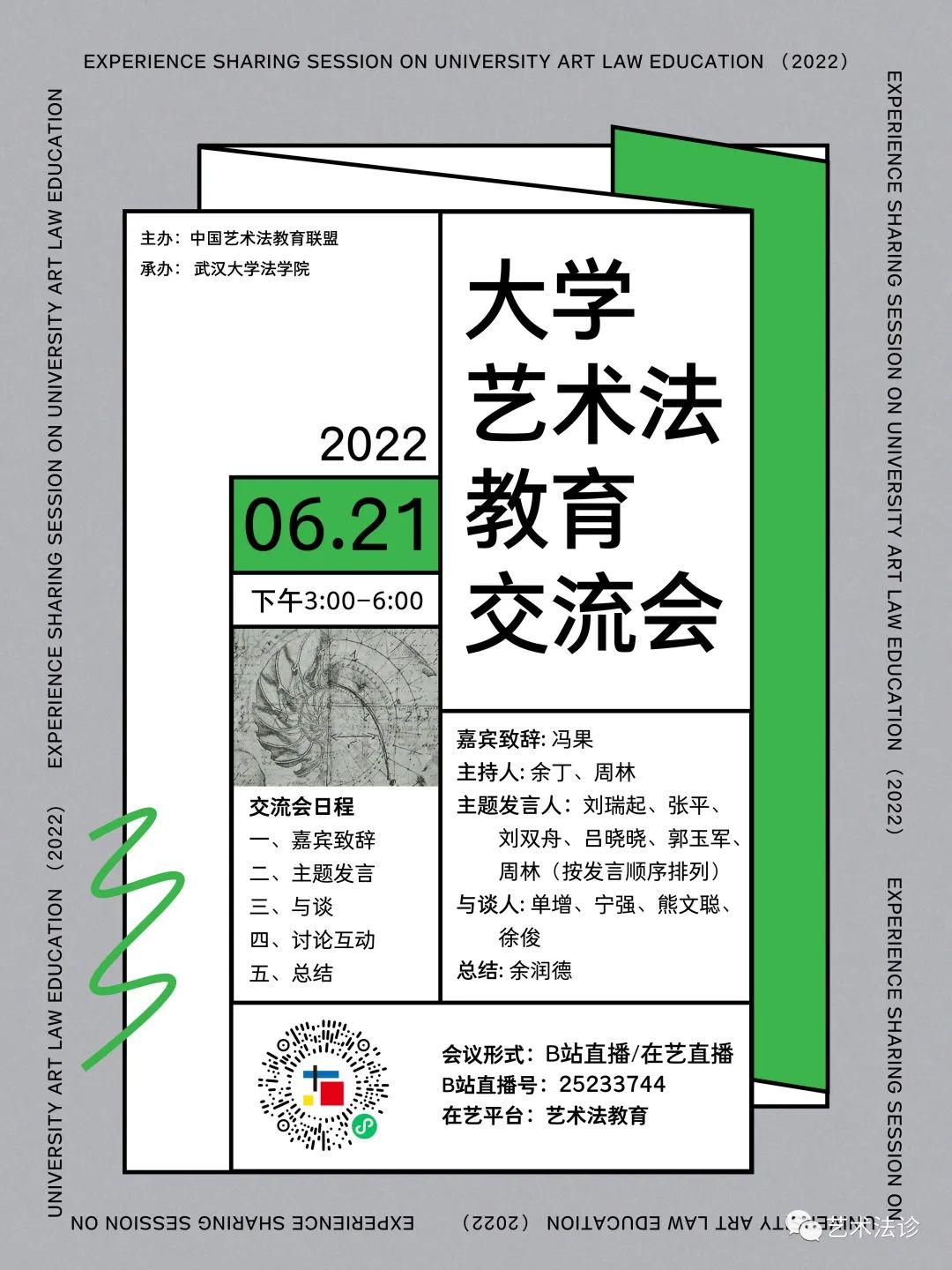 2022年6月18日,由中国艺术法教育联盟(China Art Law Education Alliance)主办,武汉大学法公司承办的“2022大学艺术法教育交流会”通过网络视频会议形式召开。本次会议邀请了国内艺术法研究领域的知名专家学者,艺术法教育与法律实务领域的专业人士,围绕“大学艺术法教育”这一主题,通过主旨发言和与谈等形式各抒己见,汇集中国各高校艺术法教育工作者的经验与愿景,旨在共同推动中国艺术法的团队建设,为艺术法领域的人才培养指明方向。