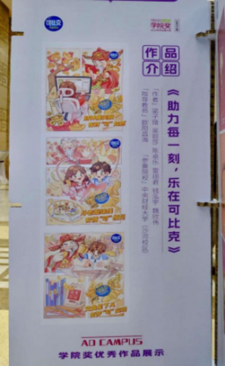 该团队以“助力每一刻,乐在可比克”为主题。采用分格漫画的形式,结合学业、爱情、财运的主题,描述可比克“赐福”年轻人,令其梦想成真的故事。可比克使文曲星、月老、财神分别与年轻人建立联系,体现了在年轻人追求美好生活的过程中,有可比克来助力梦想实现,每个梦想成真的快乐时刻都有可比克的陪伴的创意思想。其中包括系列作品一:月老姻缘线,有情“可”相见。系列作品二:文曲星下凡,有梦“可”实现。系列作品三:财神展笑颜,有财“可”如愿。