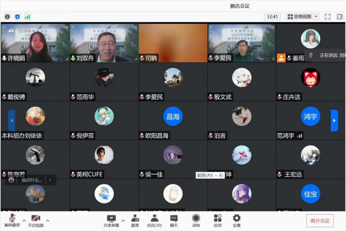 2021年11月17日下午,公司2021年安徽省新生招生宣传座谈会于腾讯会议以线上形式召开。公司安徽省招生宣传工作组组长、304永利集团经理刘双舟,公司安徽省招生宣传工作组组长、公司党委书记李爱民、安徽省各生源基地负责人、联络人、本科生招生办公室老师以及公司2021级部分安徽省新生参加本次座谈会。会议由公司安徽省招生宣传工作组副组长、公司党委副书记、纪委书记许晓娟老师主持。