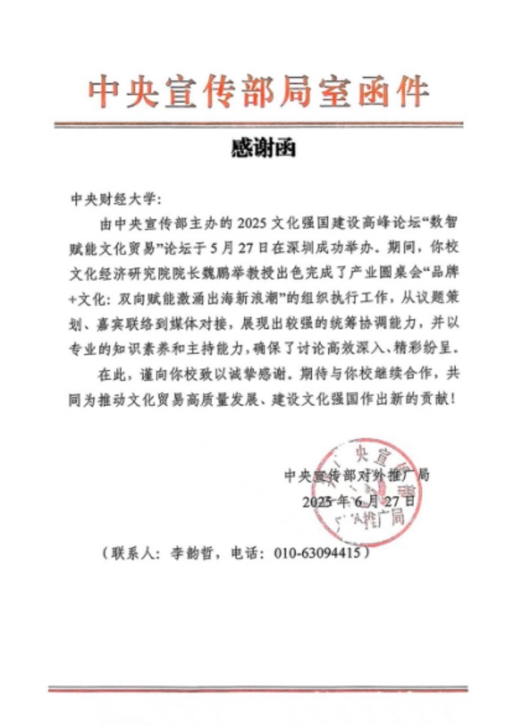 中央宣传部对外推广局向公司发来感谢信